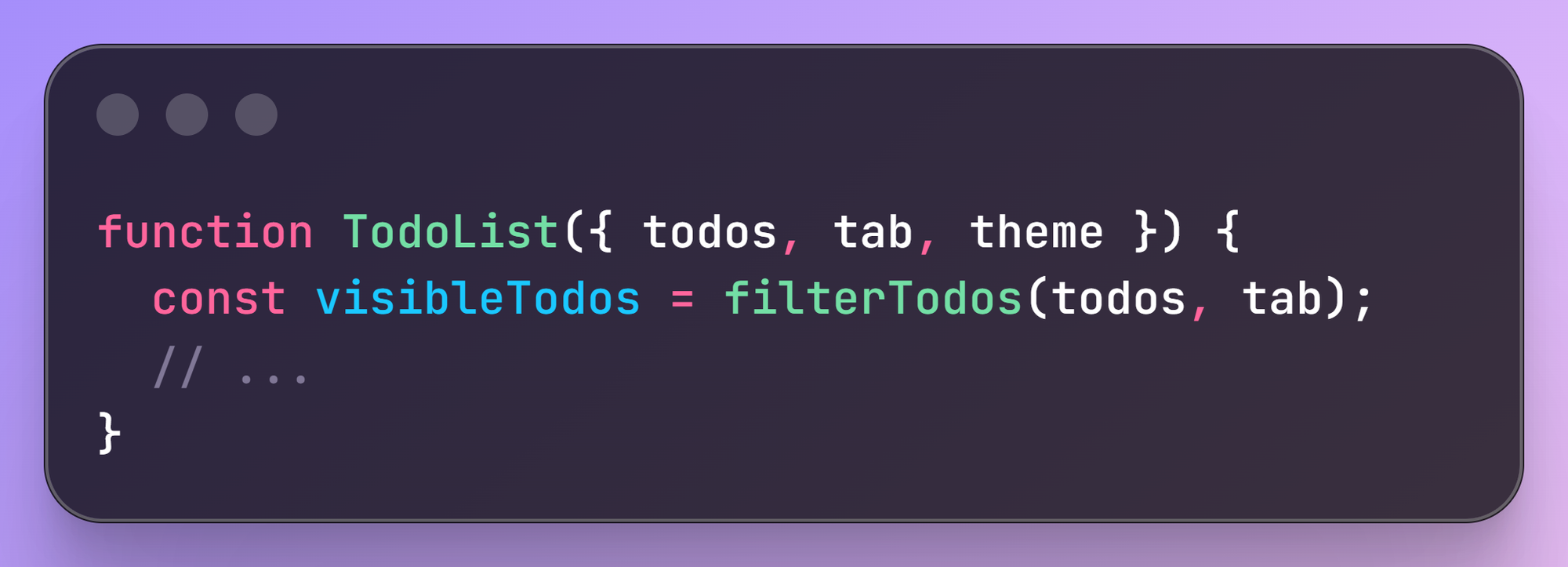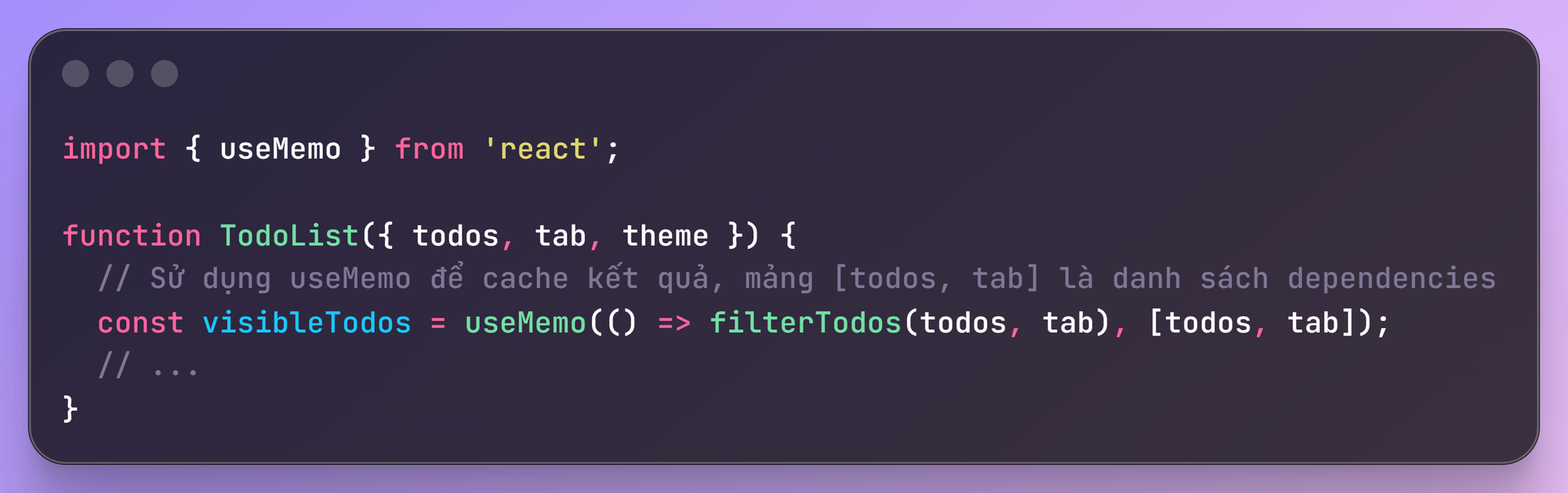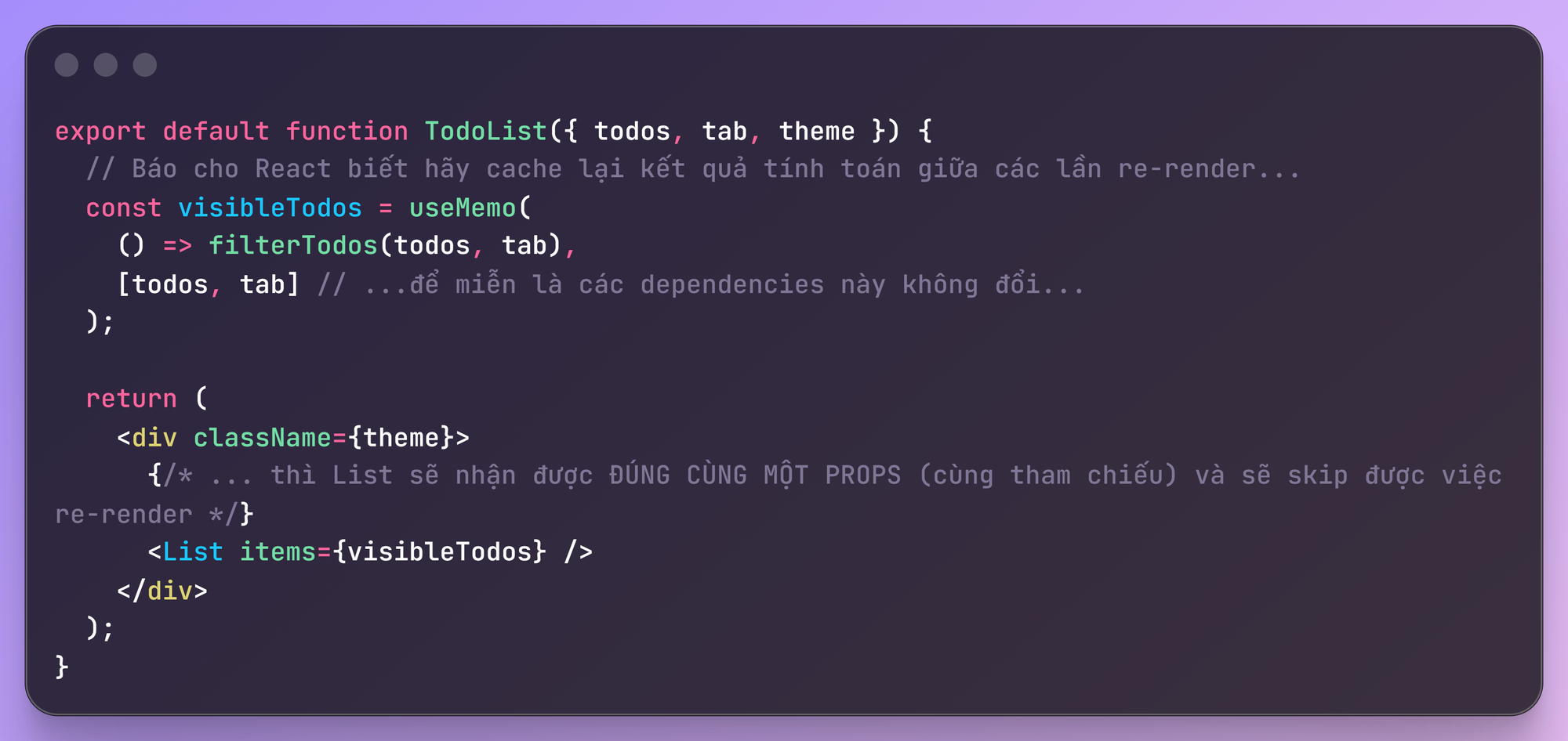 Mặc định, React sẽ chạy lại toàn bộ component mỗi khi re-render. Ví dụ, nếu TodoList cập nhật state hoặc nhận props mới từ component cha, hàm filterTodos sẽ bị gọi lại.