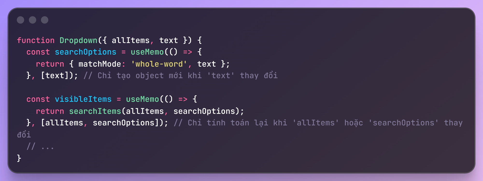 Trong ví dụ trên, nếu text không đổi, object searchOptions sẽ không bị đổi (giữ nguyên tham chiếu). Tuy nhiên, cách giải quyết tốt hơn (Best Practice) là di chuyển luôn việc khai báo object searchOptions vào HẲN BÊN TRONG hàm tính toán của useMemo: