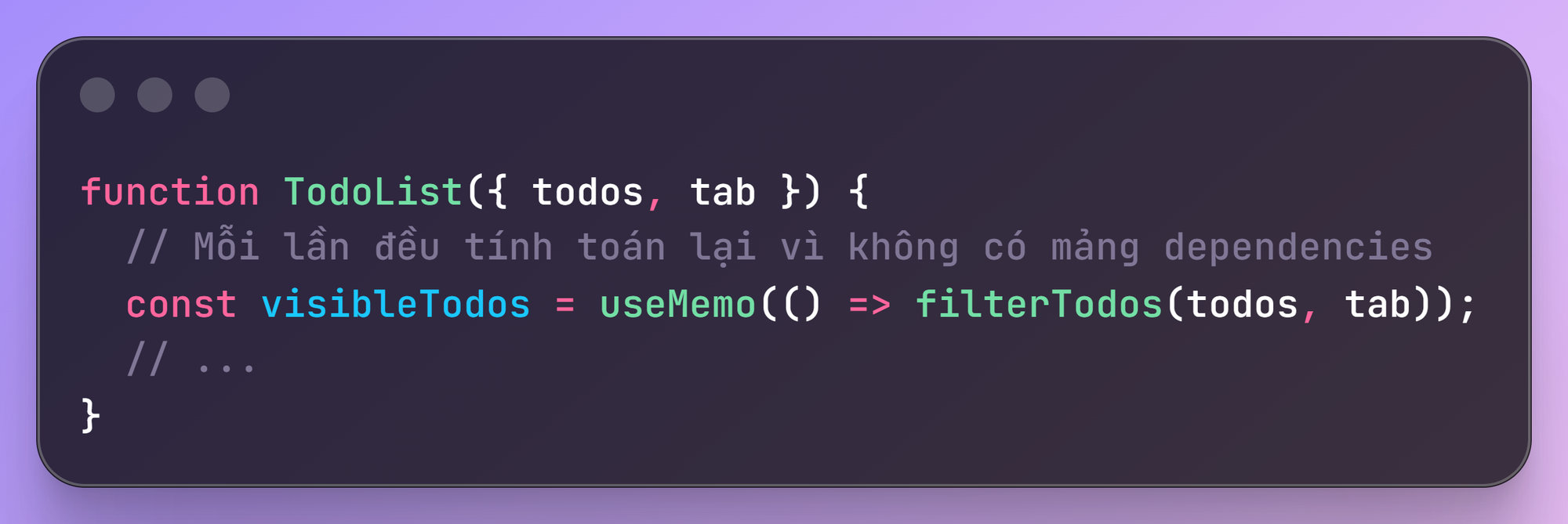 Hãy đảm bảo rằng bạn luôn truyền mảng dependencies ở tham số thứ hai! Nếu bạn quên mất mảng này, useMemo sẽ chạy lại phép tính mỗi khi component re-render (thế thì dùng useMemo làm gì nữa):