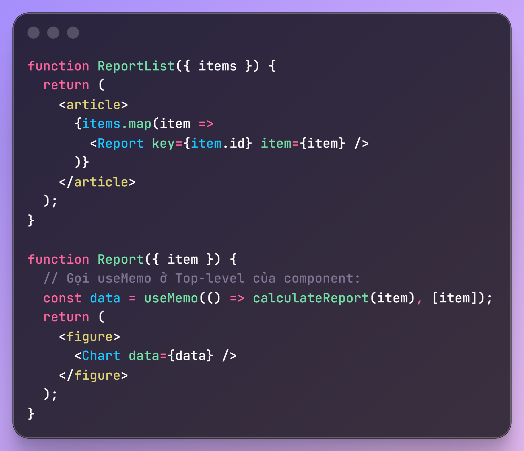Giả sử component Chart đã được bọc bằng memo. Khi component ReportList re-render, bạn muốn bỏ qua việc re-render cho từng Charttrong danh sách. Tuy nhiên, bạn không thể gọi useMemo bên trong một vòng lặp (vì vi phạm Rules of Hooks):