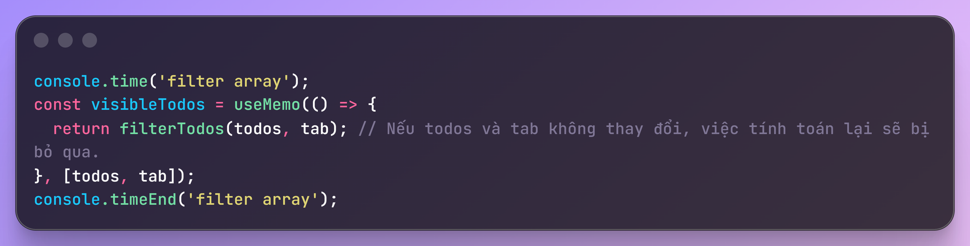 Khi todos và tab không đổi giữa các lần render, bọc phép tính trong useMemo giúp tái sử dụng kết quả visibleTodos đã tính trước đó.
