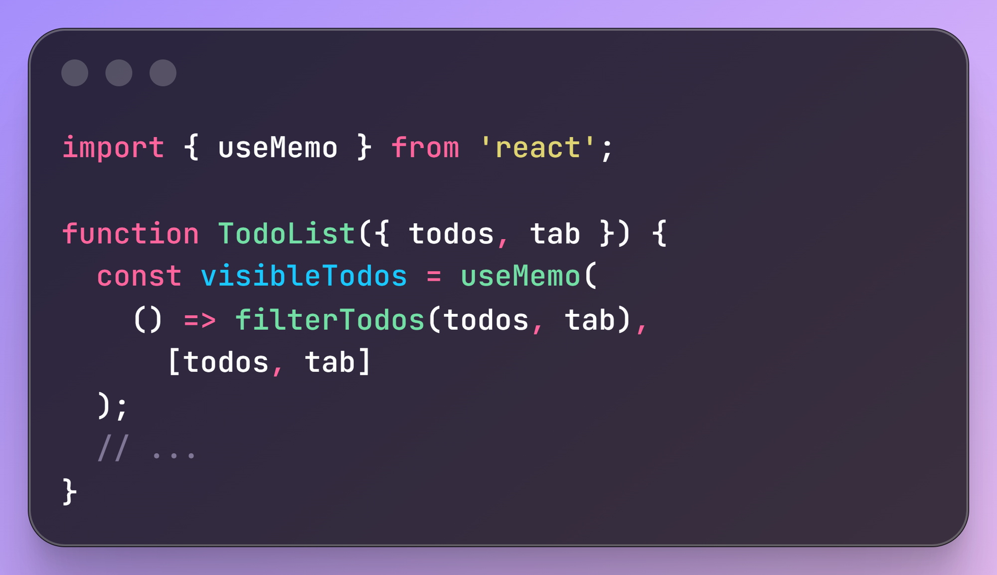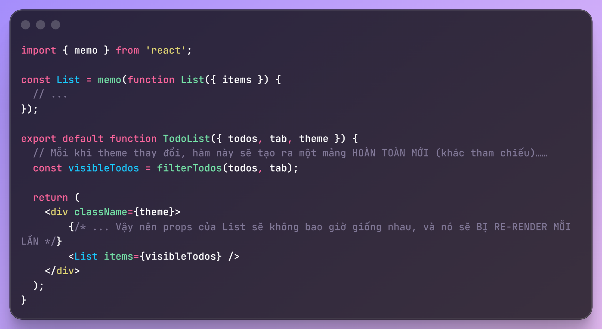 Trong ví dụ trên, hàm filterTodos luôn tạo ra một mảng mới, giống như cách bạn gõ {} thì nó luôn tạo ra một object mới ở một vùng nhớ khác. Bình thường thì chả sao cả, nhưng điều này có nghĩa là props truyền vào List sẽ không bao giờ bằng nhau (khác tham chiếu), và sự tối ưu hóa của memo coi như "vứt đi". Đây chính là lúc useMemo phát huy tác dụng: