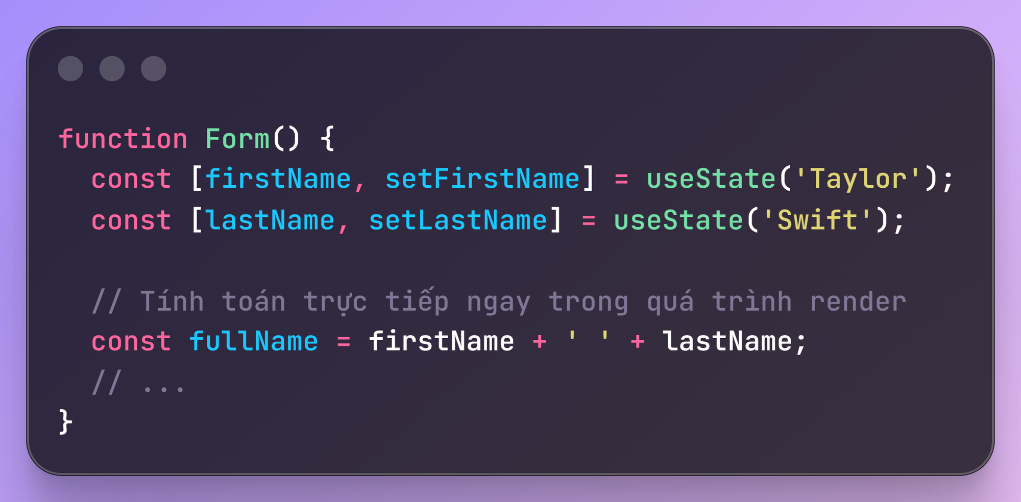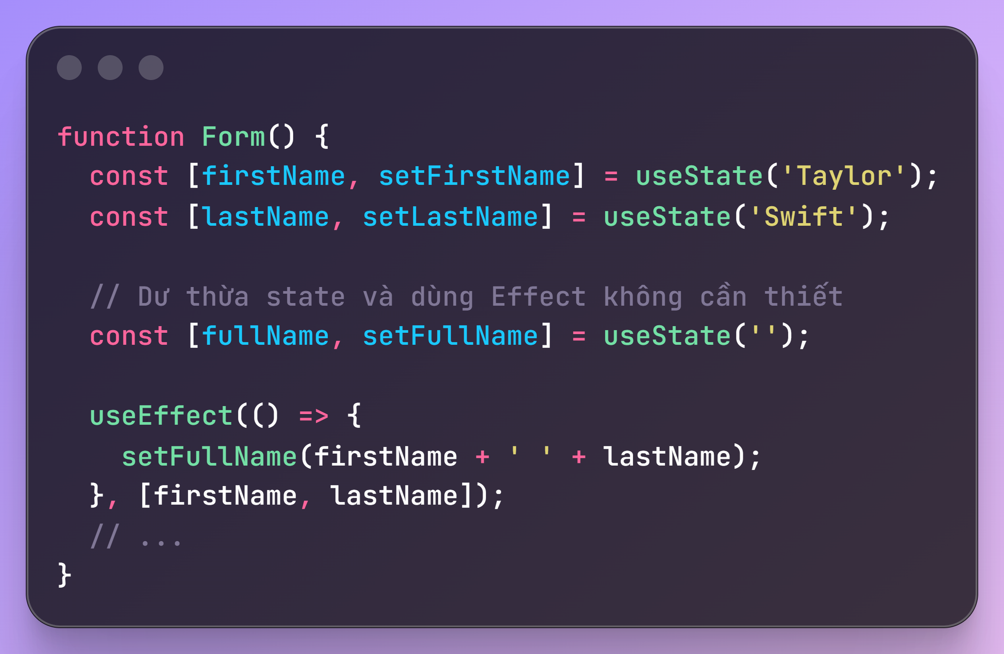 Thật sự không cần phải làm phức tạp như vậy. Hơn nữa, cách viết này cực kỳ kém hiệu quả: Đầu tiên, React sẽ chạy toàn bộ luồng render với giá trị cũ của fullName, sau đó Effect mới chạy và gọi setFullName, khiến React ngay lập tức phải re-render thêm một lần nữa với giá trị mới. Hãy xóa biến state thừa thãi và cái Effect đó đi: