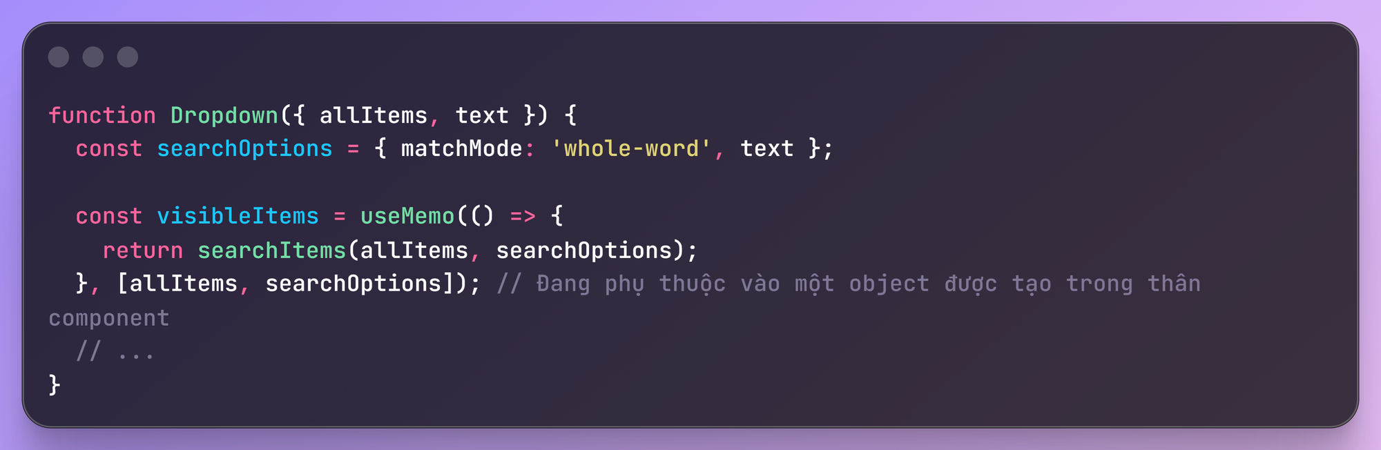 Việc phụ thuộc vào một object như thế này sẽ phá vỡ hoàn toàn cơ chế memoization. Mỗi khi component re-render, toàn bộ code bên trong thân component sẽ chạy lại từ đầu. Dòng code tạo ra object searchOptions cũng sẽ chạy lại ở mỗi lần re-render (tạo ra một object mới với địa chỉ bộ nhớ mới). Vì searchOptions là một dependency của useMemo, và mỗi lần nó lại là một object khác nhau (khác tham chiếu), React sẽ nhận định là dependency đã bị thay đổi, từ đó luôn luôn tính toán lại searchItems.