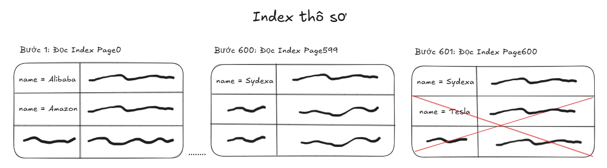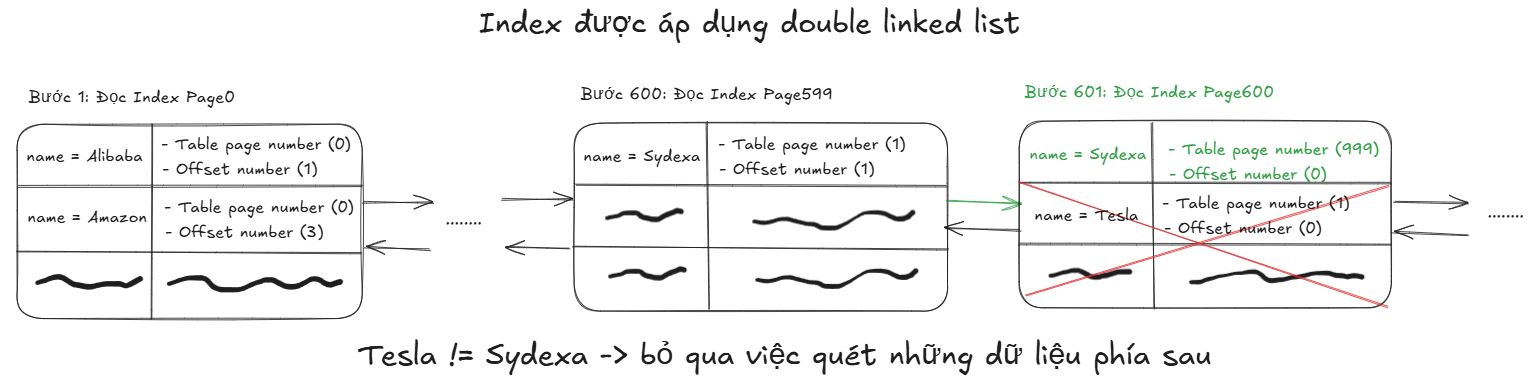 Nhờ việc dữ liệu đã được sắp xếp và liên kết bằng cấu trúc Doubly Linked List, chúng ta có thể chắc chắn rằng phía sau bản ghi name = “Sydexa” có table page number (999) tại index page (600) sẽ không còn giá trị trùng lặp với nào khác. Điều này cho phép ta bỏ qua việc quét hàng loạt dữ liệu không cần thiết, giúp tiết kiệm đáng kể thời gian và công sức.