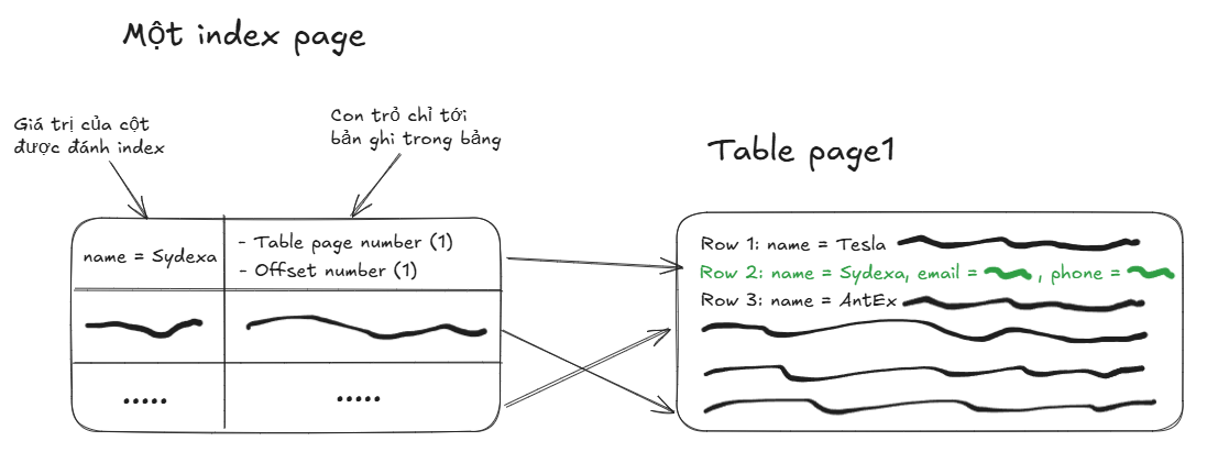 Giả sử anh em đánh index trên cột name. Sau đó anh em thực hiện một câu truy vấn SELECT name, email, phone FROM users WHERE name = 'Sydexa' . Nếu truy vấn này tìm thấy 10,000 bản ghi hợp lệ, vì index chỉ chứa giá trị của các cột được đánh index, với từng hàng dữ liệu tìm thấy được, database phải thực hiện một bước truy cập vào bảng vật lý chứa những dữ liệu đó để lấy ra được trường email và phone