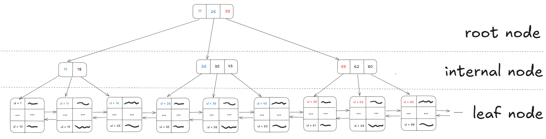 - Duyệt cây: Bắt đầu từ root node database sẽ chỉ cần duyệt cây như sau để đến được leaf node chứa id = “35”: