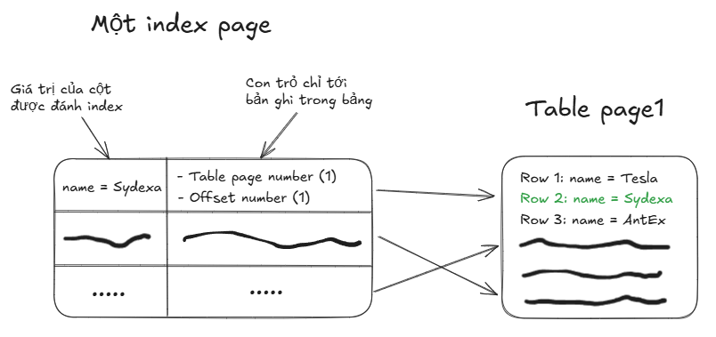 Một trang index có chứa hai giá trị, đầu tiên là giá trị của cột (hoặc các cột) được đánh index trong bảng và thứ hai là các giá trị để trỏ tới bản ghi trong bảng.