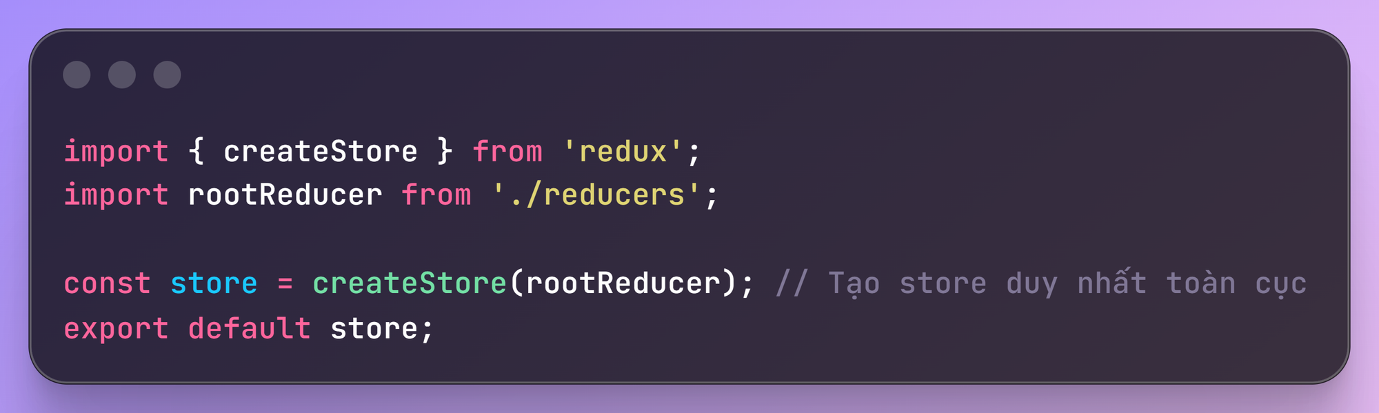 Ở đây chúng ta sẽ tạo một store thông qua hàm createStore, sau đó export (xuất) instance đó ra từ module, ví dụ: