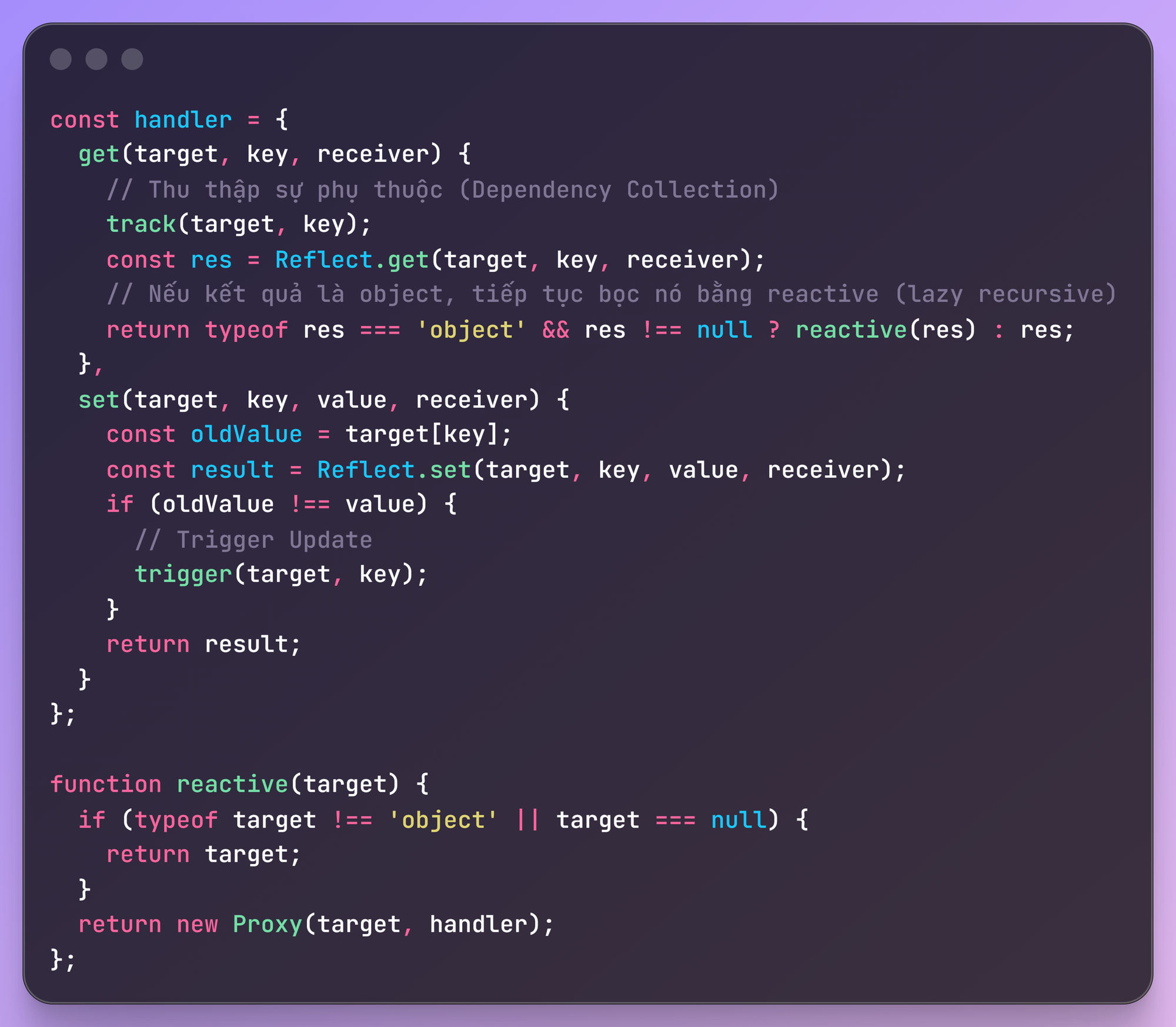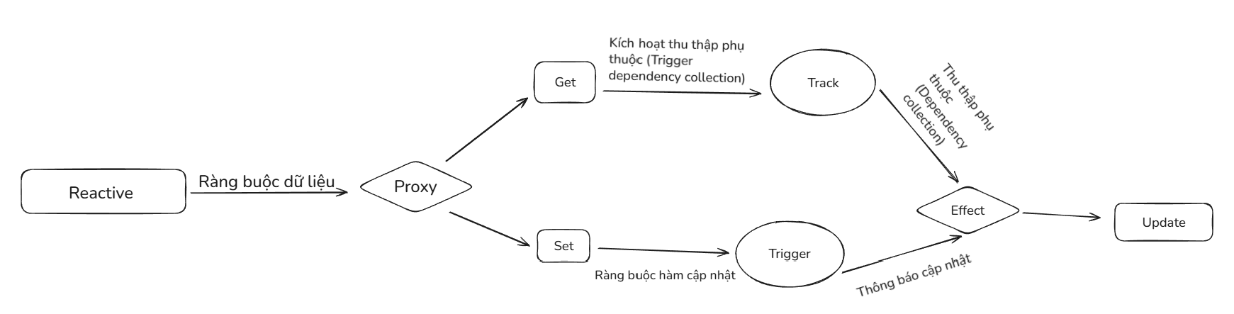 Thông qua mẫu Proxy, Vue có thể tự động kích hoạt thu thập sự phụ thuộc (dependency collection) và logic cập nhật khung nhìn (view update) khi một thuộc tính được truy cập (get) hoặc sửa đổi (set), từ đó đạt được khả năng ràng buộc dữ liệu phản ứng tự động.