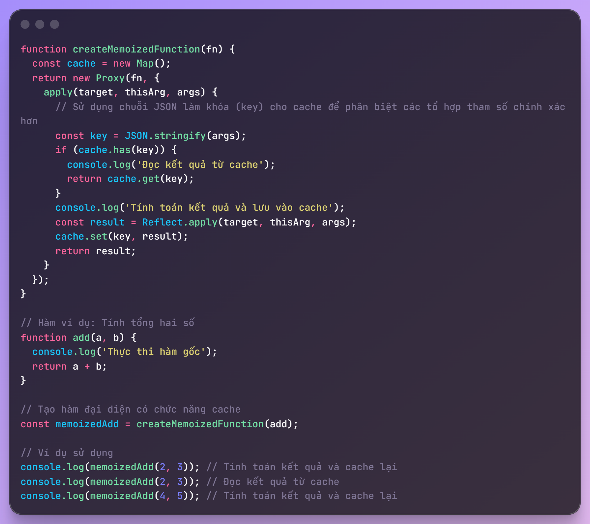 Để tránh việc phải tính toán lặp lại và nâng cao hiệu suất chương trình, chúng ta có thể tận dụng mẫu Proxy để tạo ra một "hàm đại diện" (proxy function) được tích hợp sẵn khả năng lưu bộ nhớ đệm (cache) cho hàm gốc.