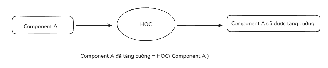 Sơ đồ này minh họa cách hoạt động của HOC: Nó nhận vào một component gốc (Component A), bao bọc nó để thêm chức năng, và trả về một phiên bản mới mạnh mẽ hơn (Enhanced Component A)