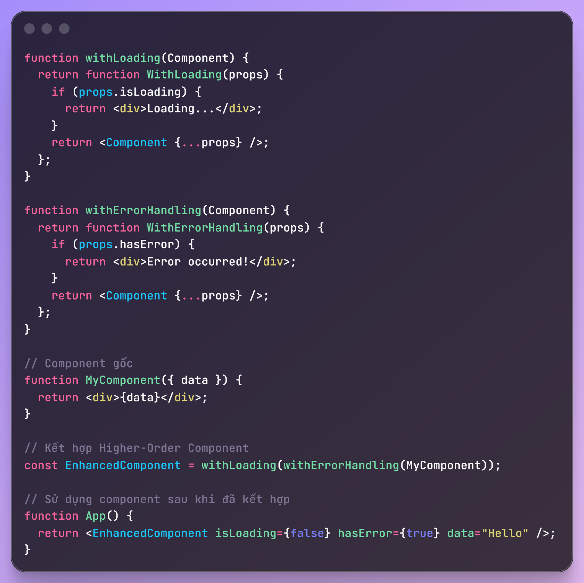 Trong ví dụ này, MyComponent được kết hợp thông qua hai HOC là withLoading và withErrorHandling, lần lượt tăng cường chức năng trạng thái loading và xử lý lỗi. Cách kết hợp này giống như việc nhiều decorator (bộ trang trí) cùng tăng cường chức năng cho một đối tượng trong Mẫu Decorator.