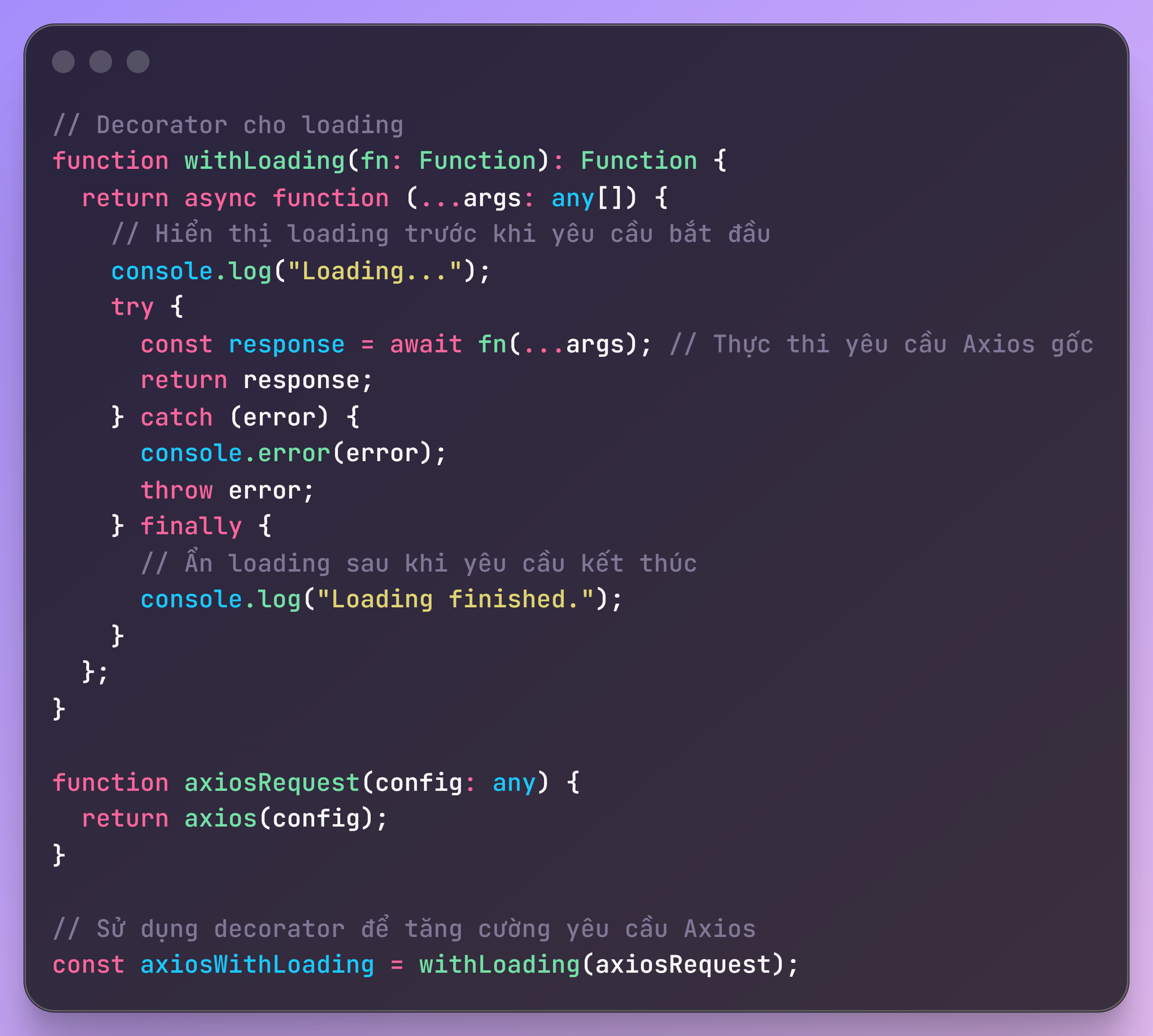Trong quá trình phát triển thực tế, chúng ta thường cần hiển thị thông báo loading khi gửi Axios request, và ẩn nó đi sau khi request hoàn tất. Việc sử dụng Decorator Pattern giúp dễ dàng thêm việc này này vào phương thức request của Axios mà không cần sửa đổi logic của request gốc.