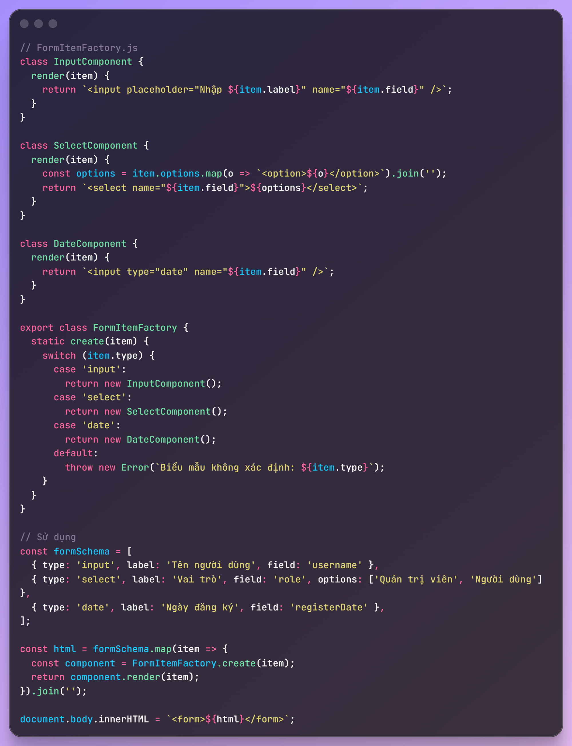 Cấu hình form từ backend, các loại type khác nhau cần render component khác nhau, chúng ta có thể sử dụng Factory Pattern để tạo động: