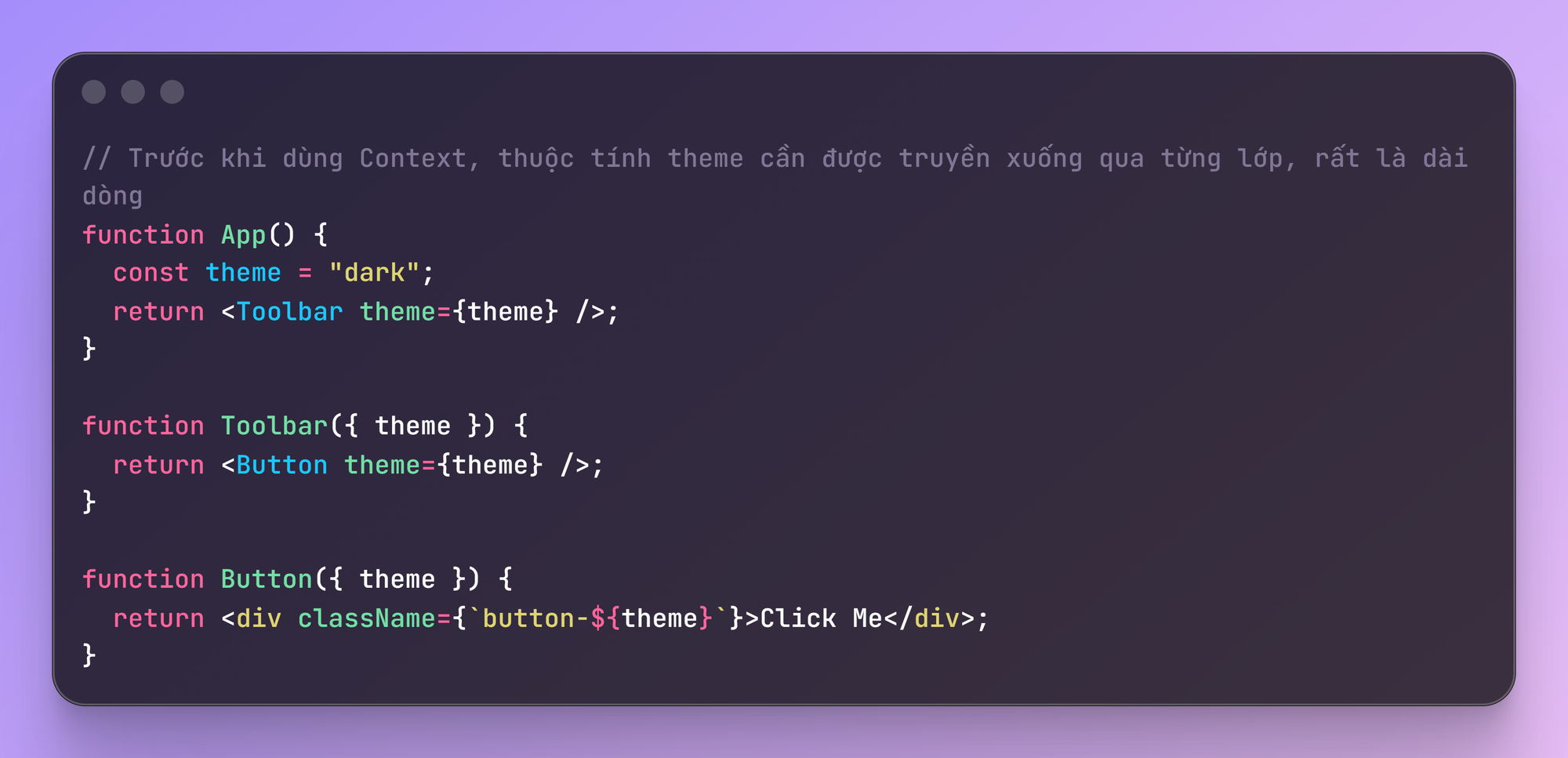 Trong khi đó, Context giống như một đường ống, cho phép component Button có thể lấy trực tiếp dữ liệu mà component App cung cấp: