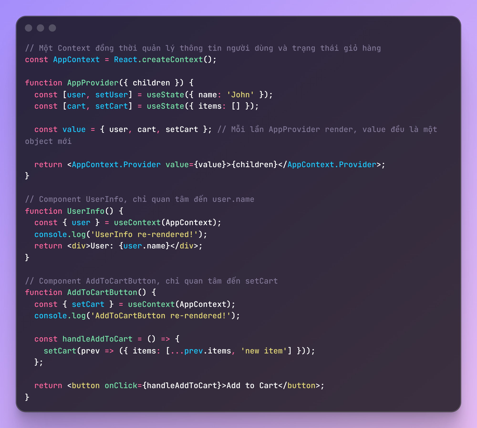 Trong ví dụ này, khi bạn click vào nút "Add to Cart", setCart được gọi, AppProvider re-render. Bạn sẽ thấy trong console, cả UserInfo re-rendered! và AddToCartButton re-rendered! đều được in ra cùng lúc.