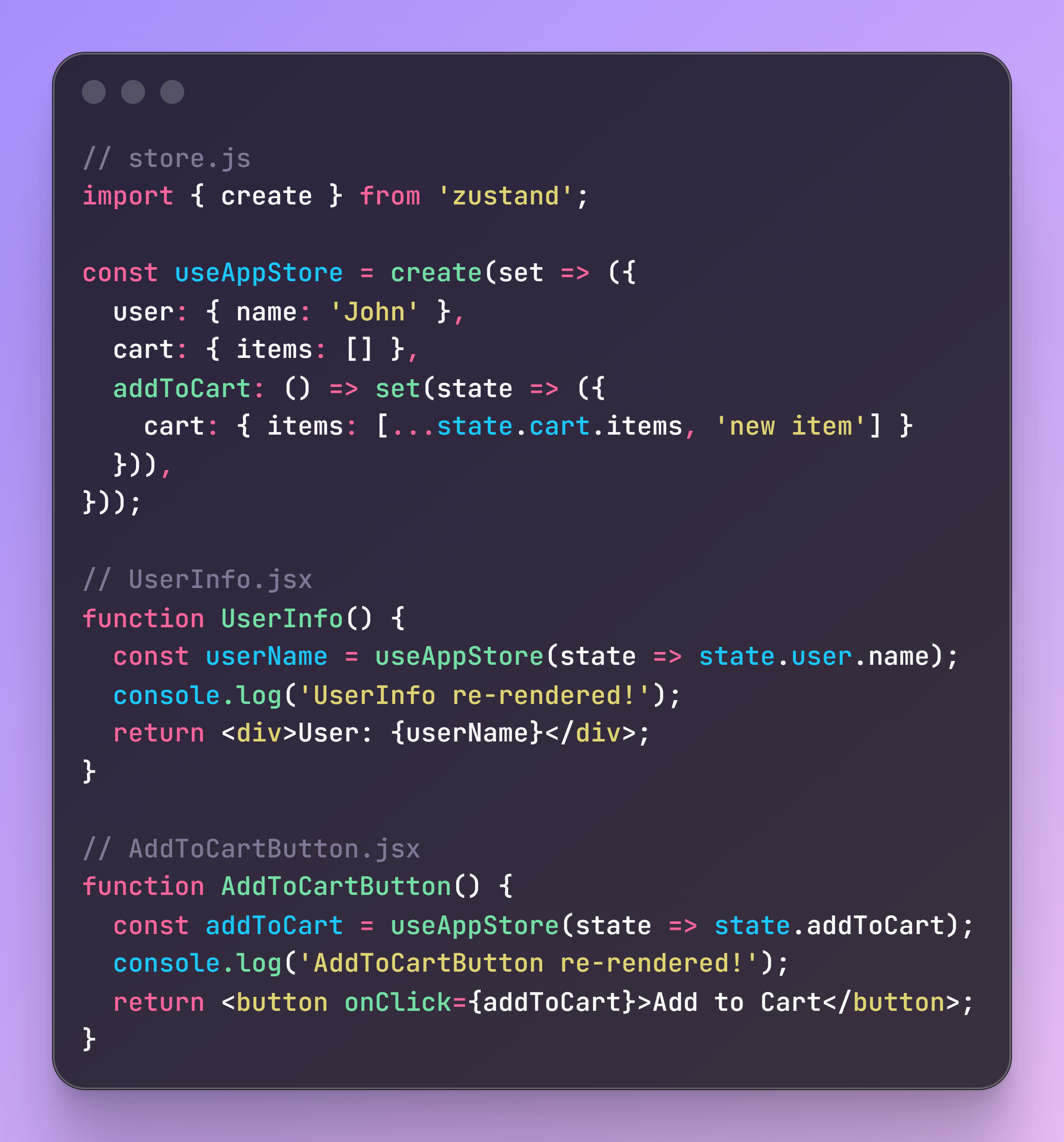 Hãy lấy ví dụ với Zustand vì nó ngắn gọn hơn: