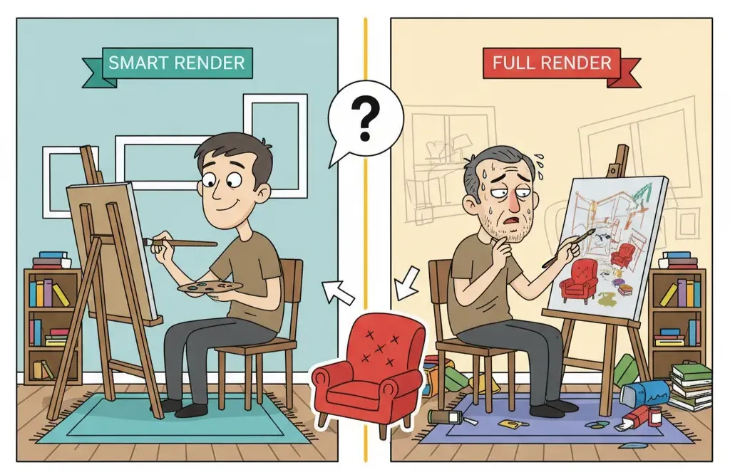 - Hơi không thông minh cho lắm: Vẽ lại toàn bộ căn phòng (re-render không cần thiết)