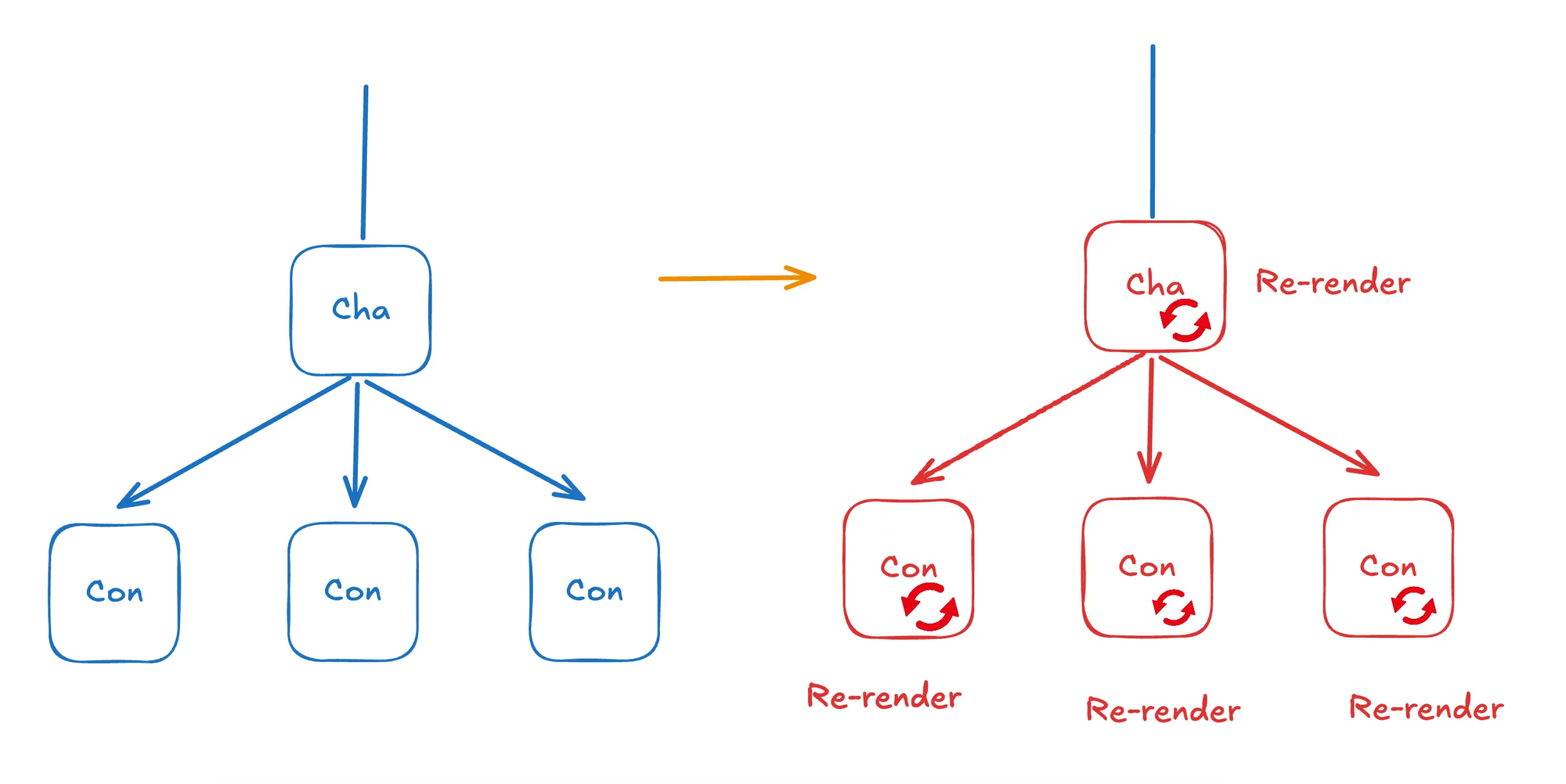 Re-render luôn đi "xuống" cây component (top-down). Re-render của con không bao giờ trigger re-render của cha trên cây