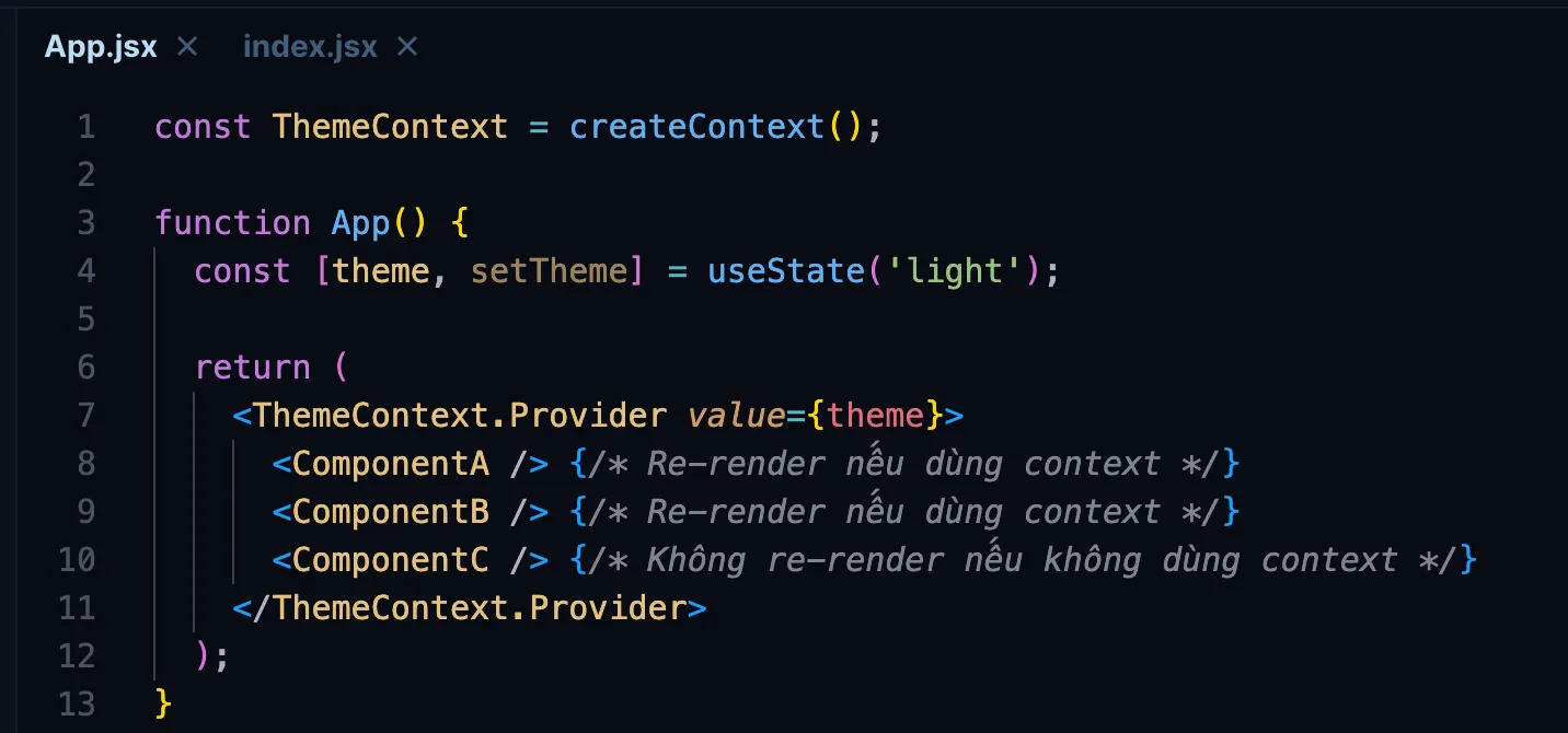 Tất cả components sử dụng Context sẽ re-render khi value thay đổi, ngay cả khi component chỉ dùng một phần của data
