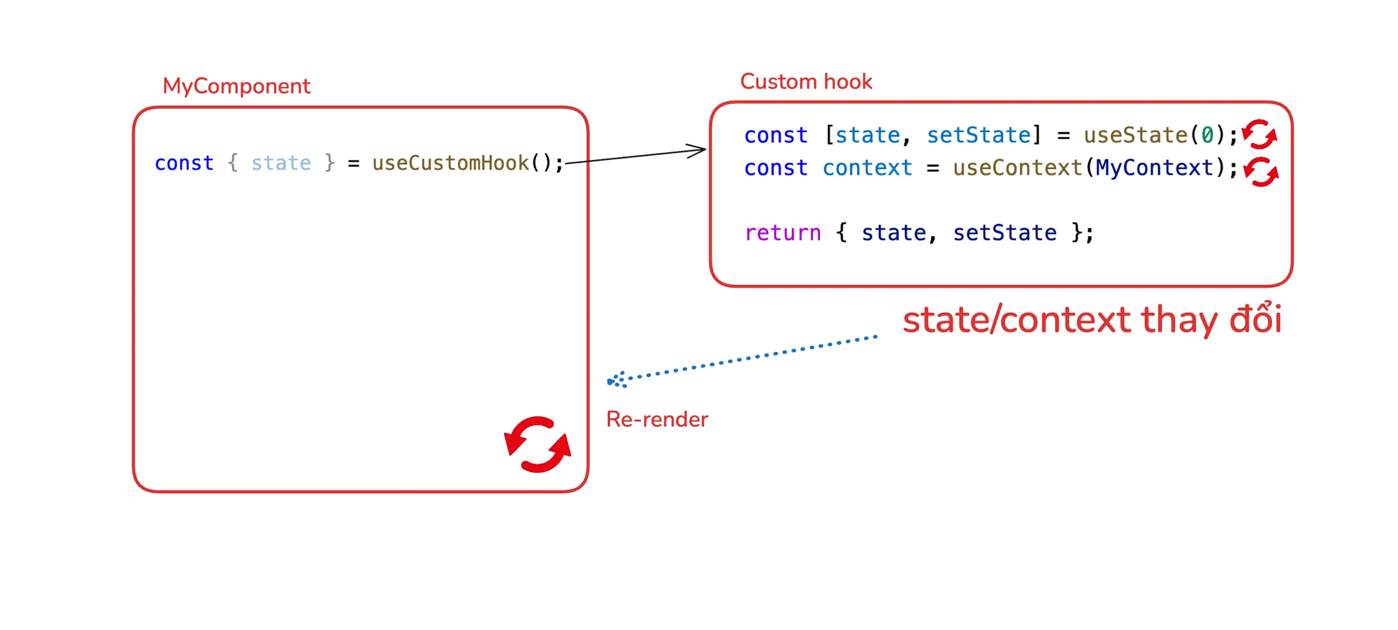 Bất kể bạn có bao nhiêu custom hooks, tất cả đều "thuộc về" component sử dụng chúng. State hay Context thay đổi trong bất kỳ hook nào cũng sẽ khiến re-render của component chứa chúng.