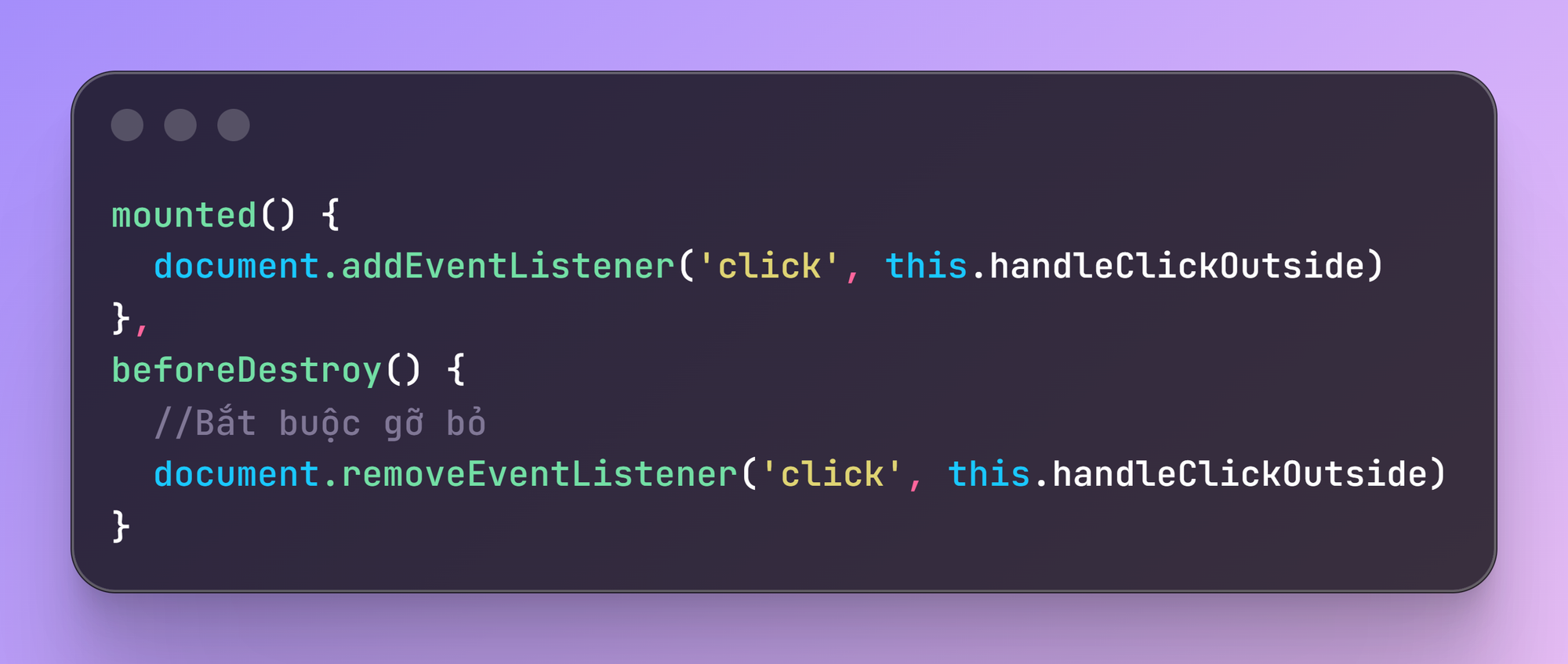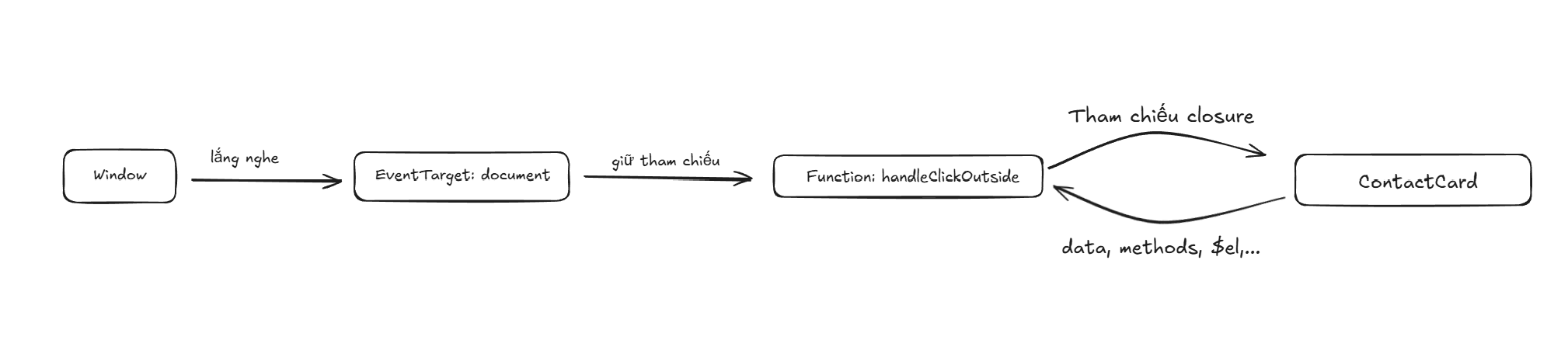 addEventListenerkhiến phần tử đích (document) giữ tham chiếu đến hàm lắng nghe- Nếu hàm lắng nghe là phương thức của component, nó thường thông qua closure tham chiếu đến toàn bộ instance component