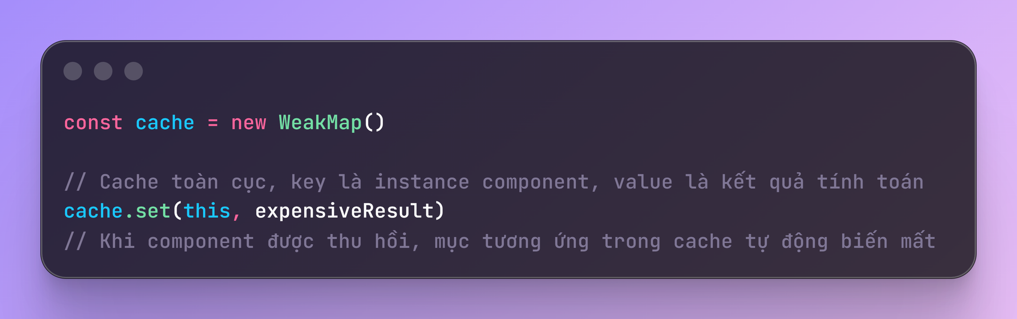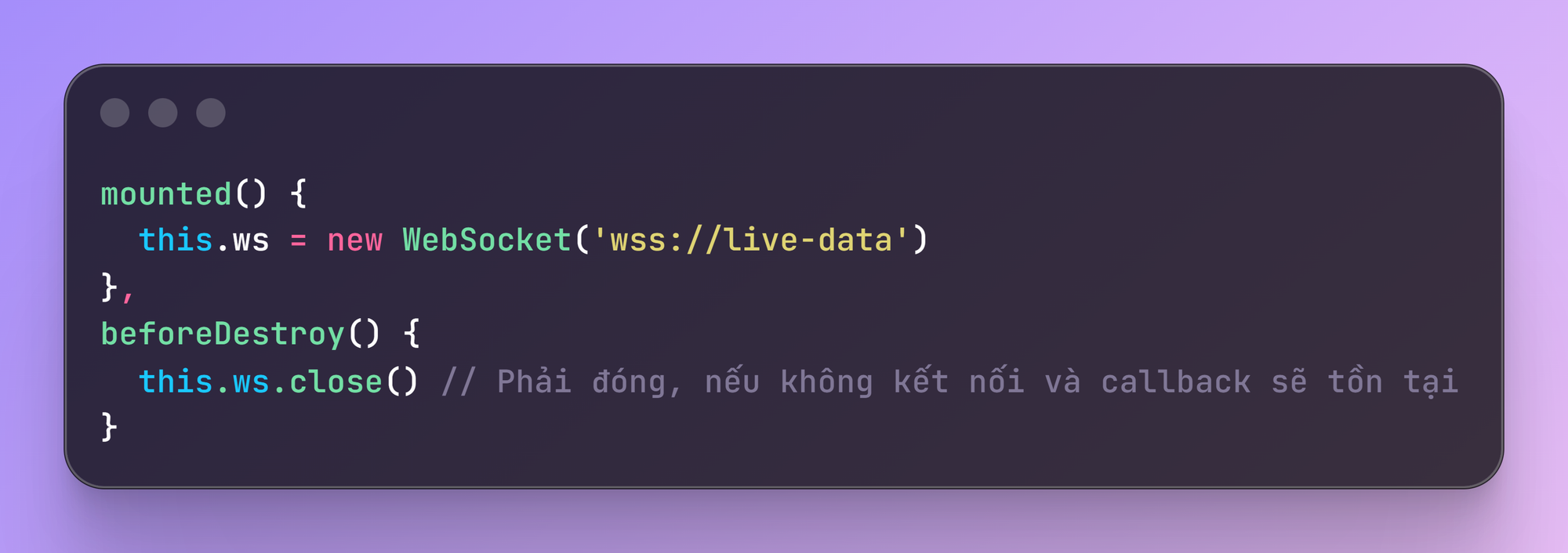 - Ngay cả khi component bị hủy, DOM bị gỡ bỏ, chỉ cần trình nghe chưa bị xóa, GC (Garbage Collector) sẽ không dám thu hồi instance này