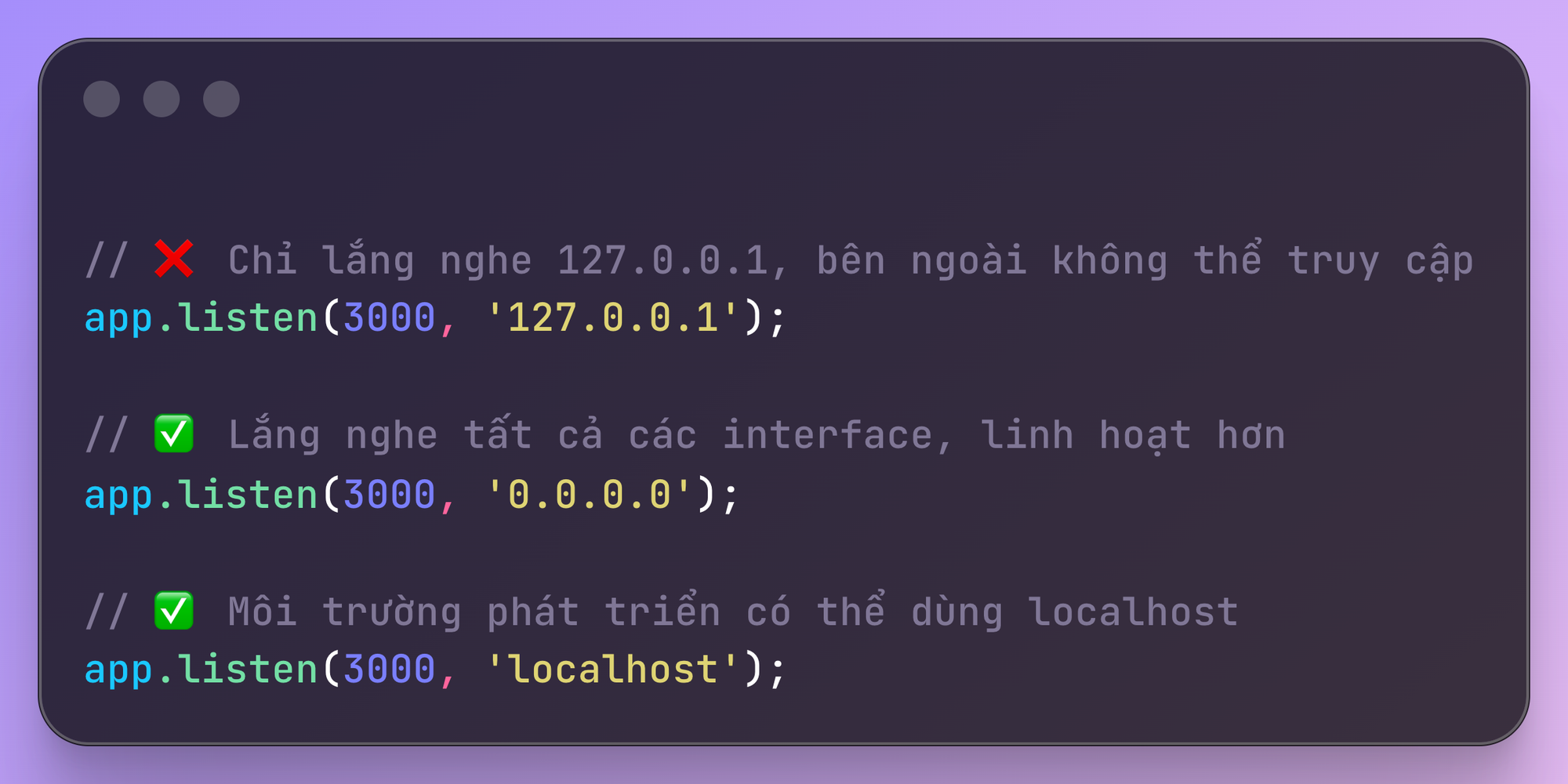 127.0.0.1:3000vẫn hoạt động bình thườnglocalhost:3000sẽ kết nối đến192.168.1.100, có thể kết nối thất bại