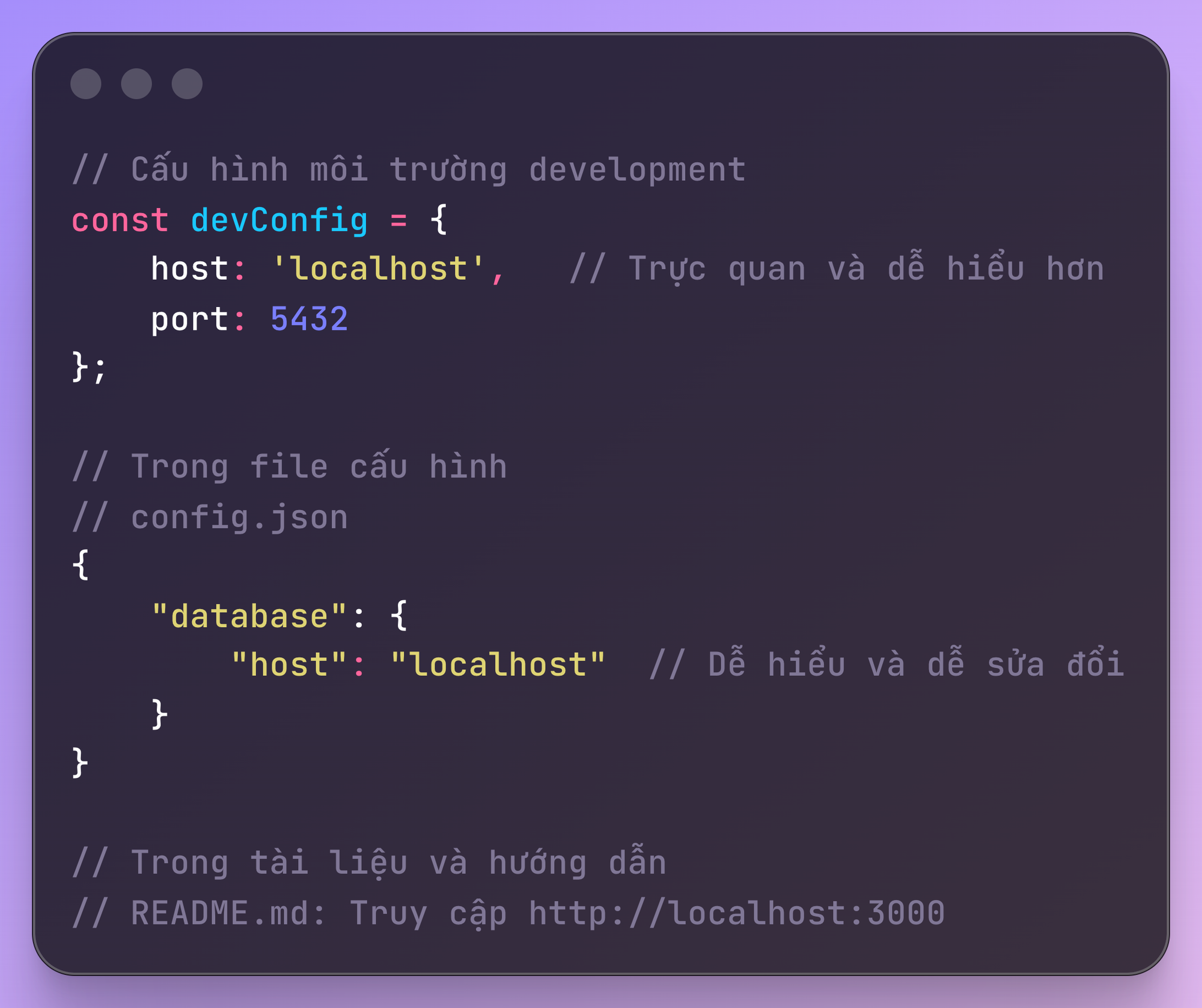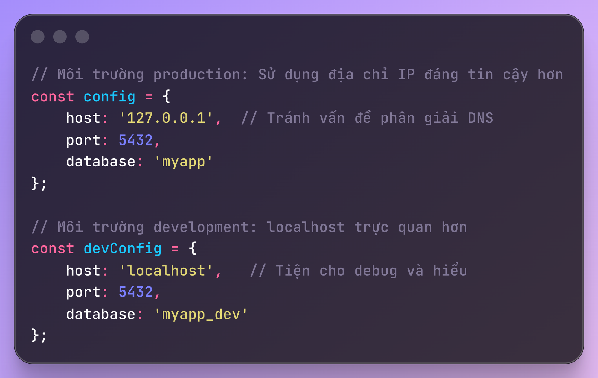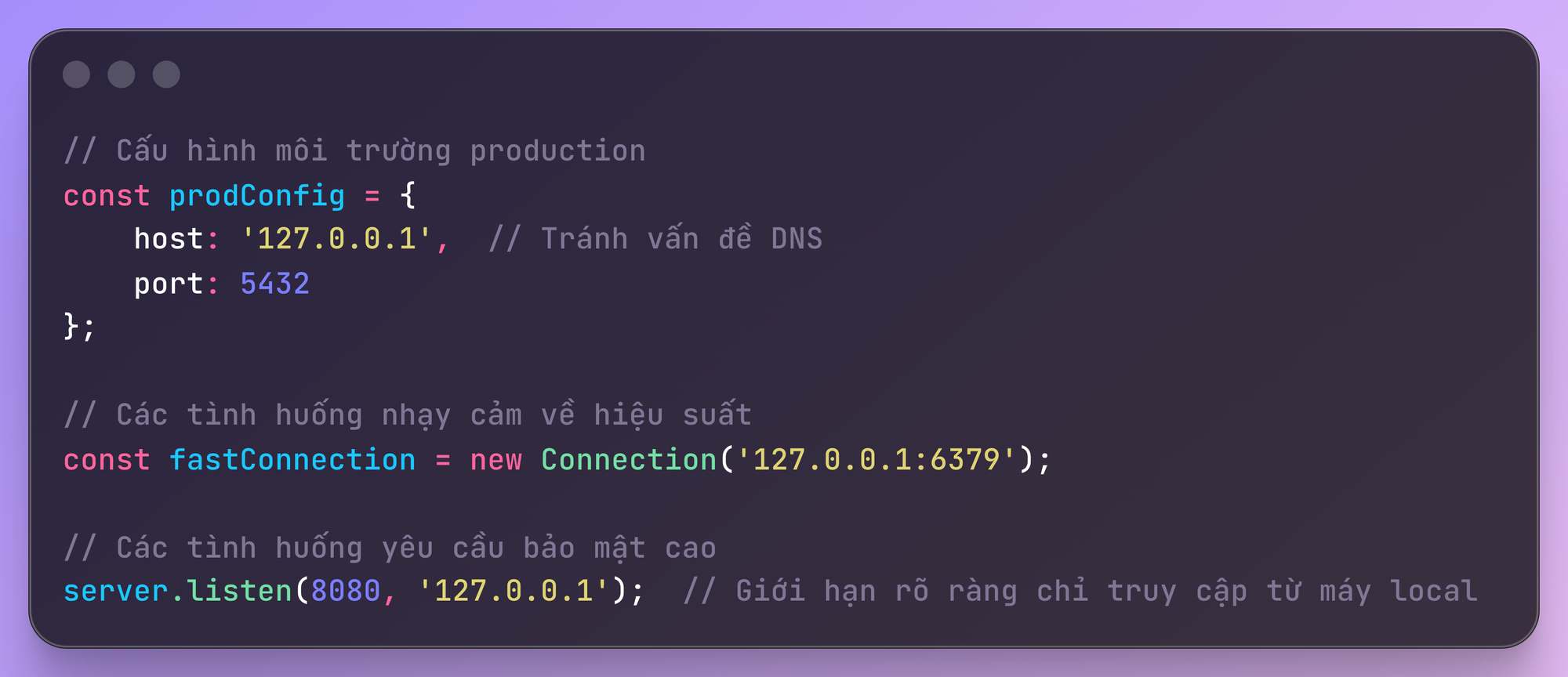 - Môi trường production: Ưu tiên sử dụng 127.0.0.1, tránh vấn đề DNS