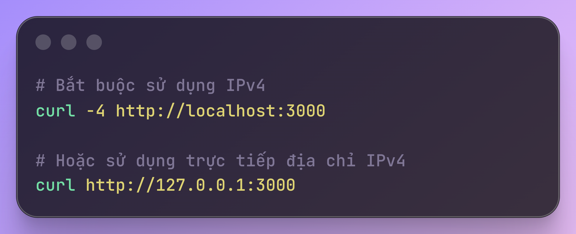 localhostcó thể phân giải thành địa chỉ IPv6::1- Nếu ứng dụng chỉ listen IPv4, kết nối sẽ thất bại