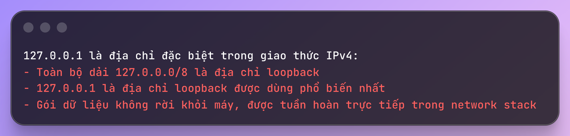 127.0.0.0/8được dành riêng làm địa chỉ loopback - Các gói dữ liệu tuần hoàn bên trong network stack, không đi qua card mạng vật lý