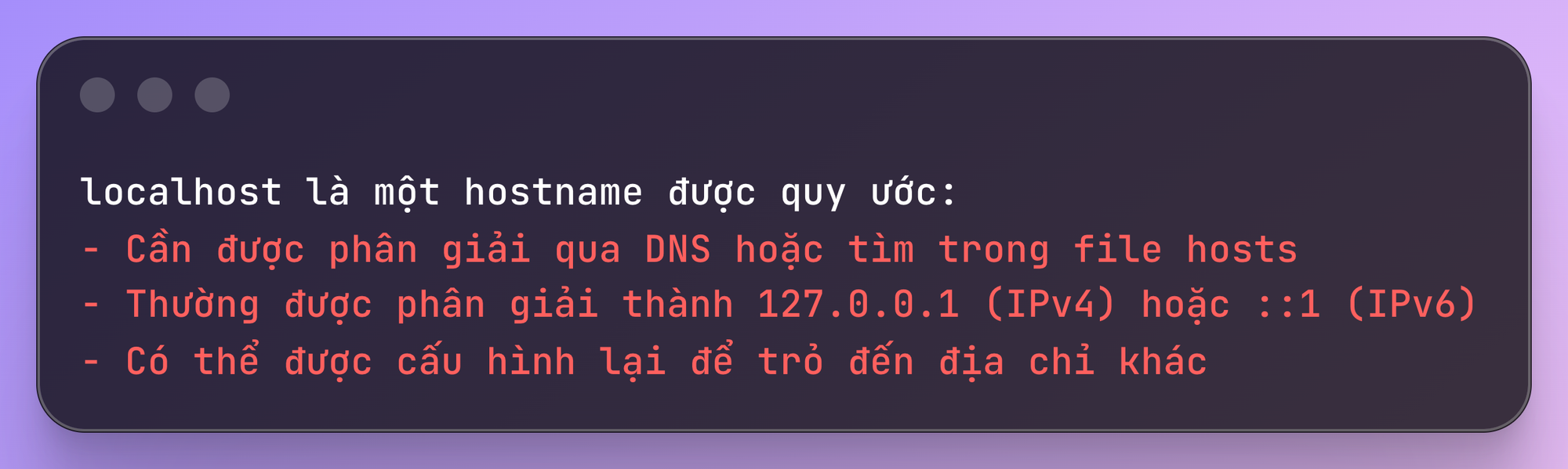 127.0.0.1là một địa chỉ IP, trực tiếp trỏ đến network interfacelocalhostlà một hostname, cần thông qua DNS resolution mới có thể tìm thấy địa chỉ IP tương ứng