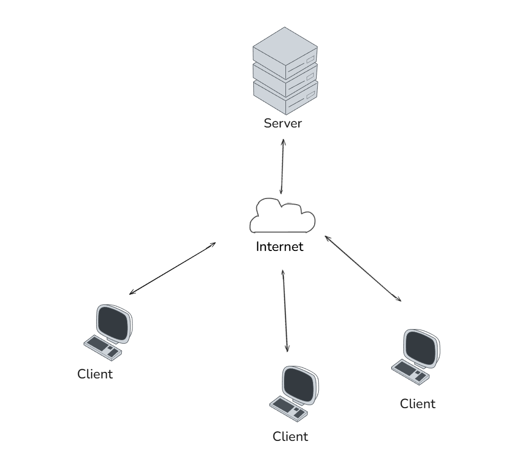 Hãy tượng tượng bạn (Client) vào một nhà hàng, bạn gọi người phục vụ (Network) đến và bắt đầu gọi món, người phục vụ sẽ đưa yêu cầu của bạn đến nhà bếp (Server), nhà bếp sẽ làm món ăn, sau đó đưa cho người phục vụ và cuối cùng bạn sẽ nhận được món ăn.