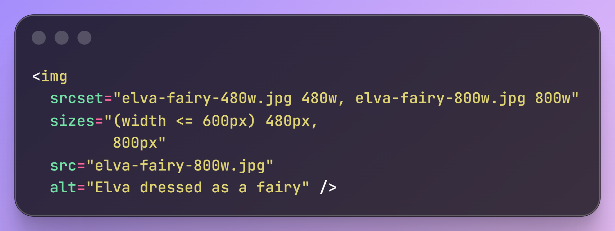 srcset: Cung cấp các biến thể ảnh với độ rộng khác nhau, giá trịwbiểu thị chiều rộng gốc của ảnhsizes: Định nghĩa độ rộng hiển thị của ảnh trong các điều kiện media khác nhau- Media query: Khớp các quy tắc hiển thị khác nhau dựa trên độ rộng viewport