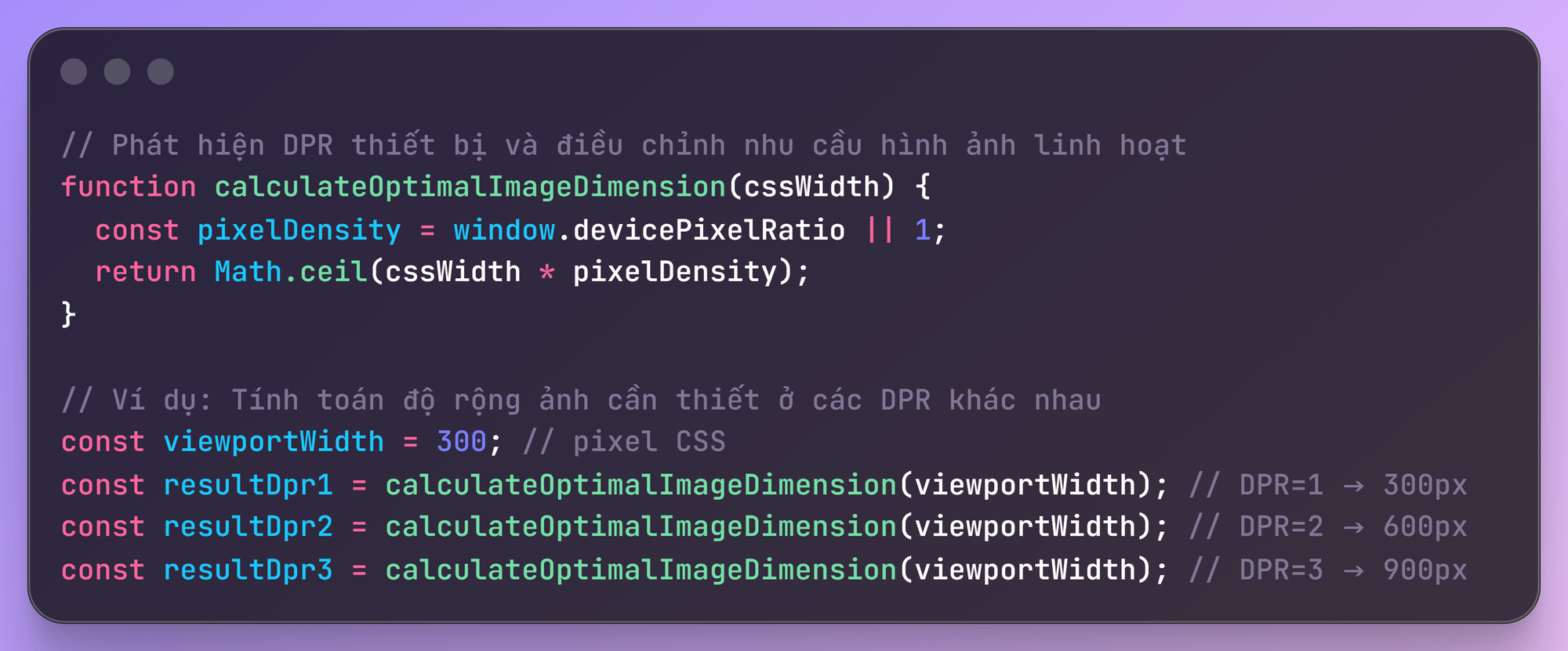 Logic trọng tâm: Độ rộng pixel cần thiết của ảnh bằng độ rộng hiển thị CSS nhân với tỷ lệ pixel thiết bị.