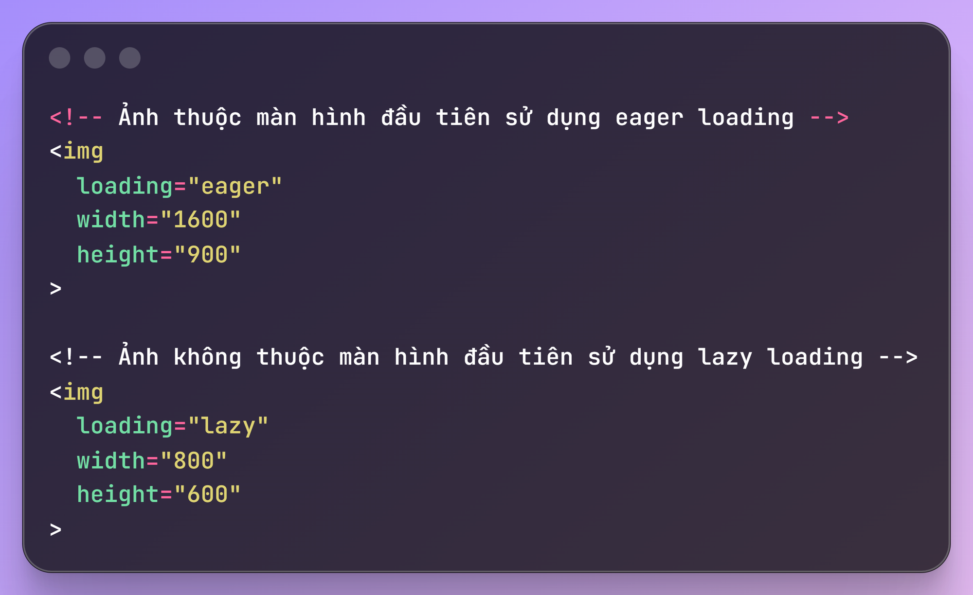 loading="eager": Chỉ thị trình duyệt ưu tiên tải tài nguyên nàyloading="lazy": Chỉ thị trình duyệt chỉ tải khi tài nguyên gần với viewport