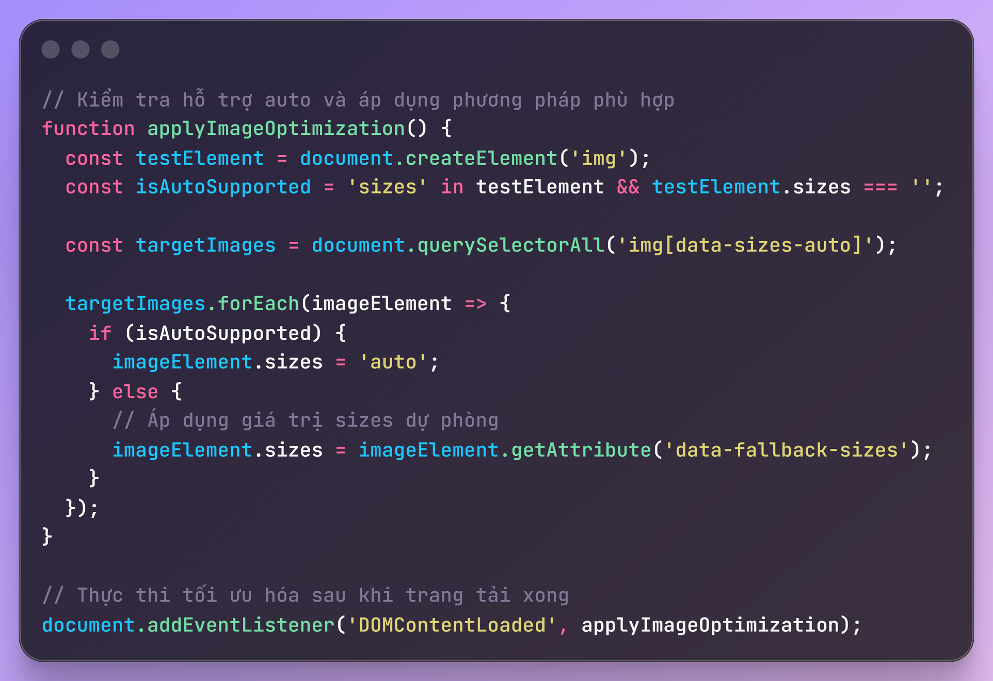 applyImageOptimization: Hàm chính để tối ưu hóa hình ảnhtestElement: Phần tử thử nghiệm để kiểm tra hỗ trợ tính năngisAutoSupported: Kiểm tra hỗ trợ trình duyệt thông qua thuộc tínhsizescủa phần tử imgtargetImages: Danh sách các hình ảnh cần được tối ưu hóaimageElement: Phần tử hình ảnh trong vòng lặpdata-fallback-sizes: Giá trịsizesđược đặt trước cho các trình duyệt không hỗ trợauto